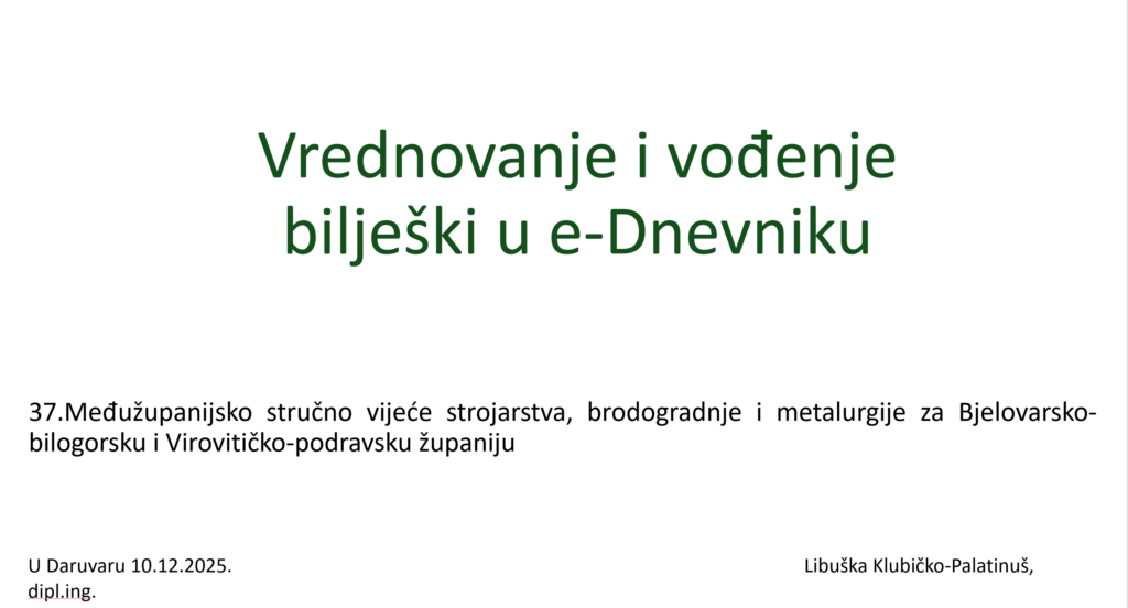 Međužupanijsko stručno vijeće za sektor strojarstva, brodogradnje i metalurgije održano je u srijedu 10. 12. 2025. godine s početkom u 15,00 sati u prostorijama Tehničke škole Daruvar, Zrinskoga 19. Na stručnom vijeću raspravljalo se o vrednovanju i vođenju bilješki u e-Dnevniku, primjeni digitalnih tehnologija temeljenih na umjetnoj inteligenciji u obrazovanju- BrAIn i o modularnoj nastavi.